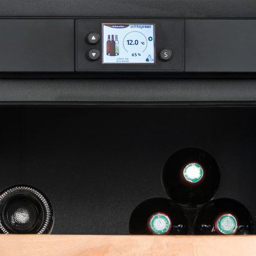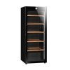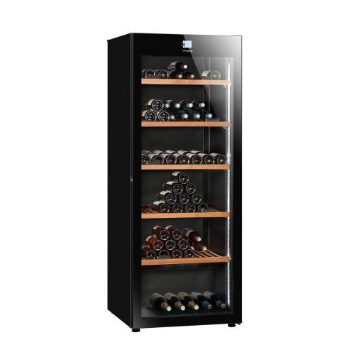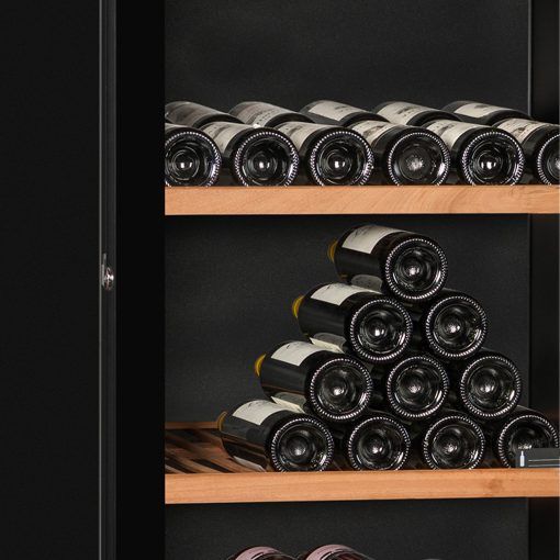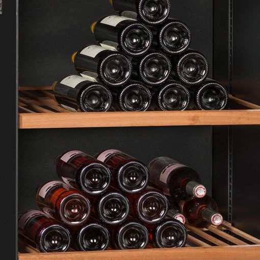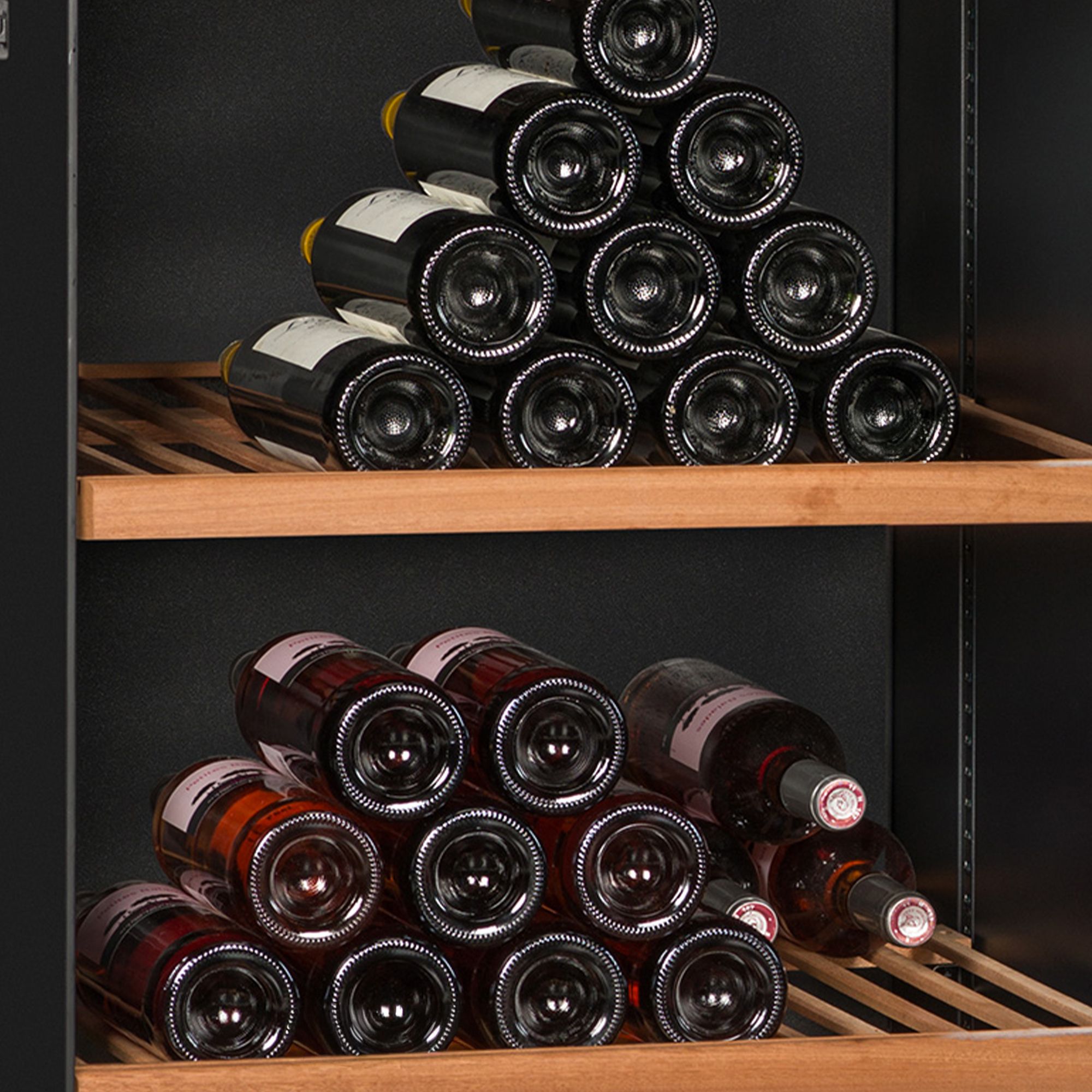 Klar til brug – og kan udbygges: Leveres med 5 træhylder af træsorten sapelli. Vinkøleskabet er også kompatibelt med et bredt udvalg af ekstraudstyr (præsentationshylder, skuffer, bokse m.m.), hvilket gør det let at tilpasse indretningen efter flaskeformer og behov.
